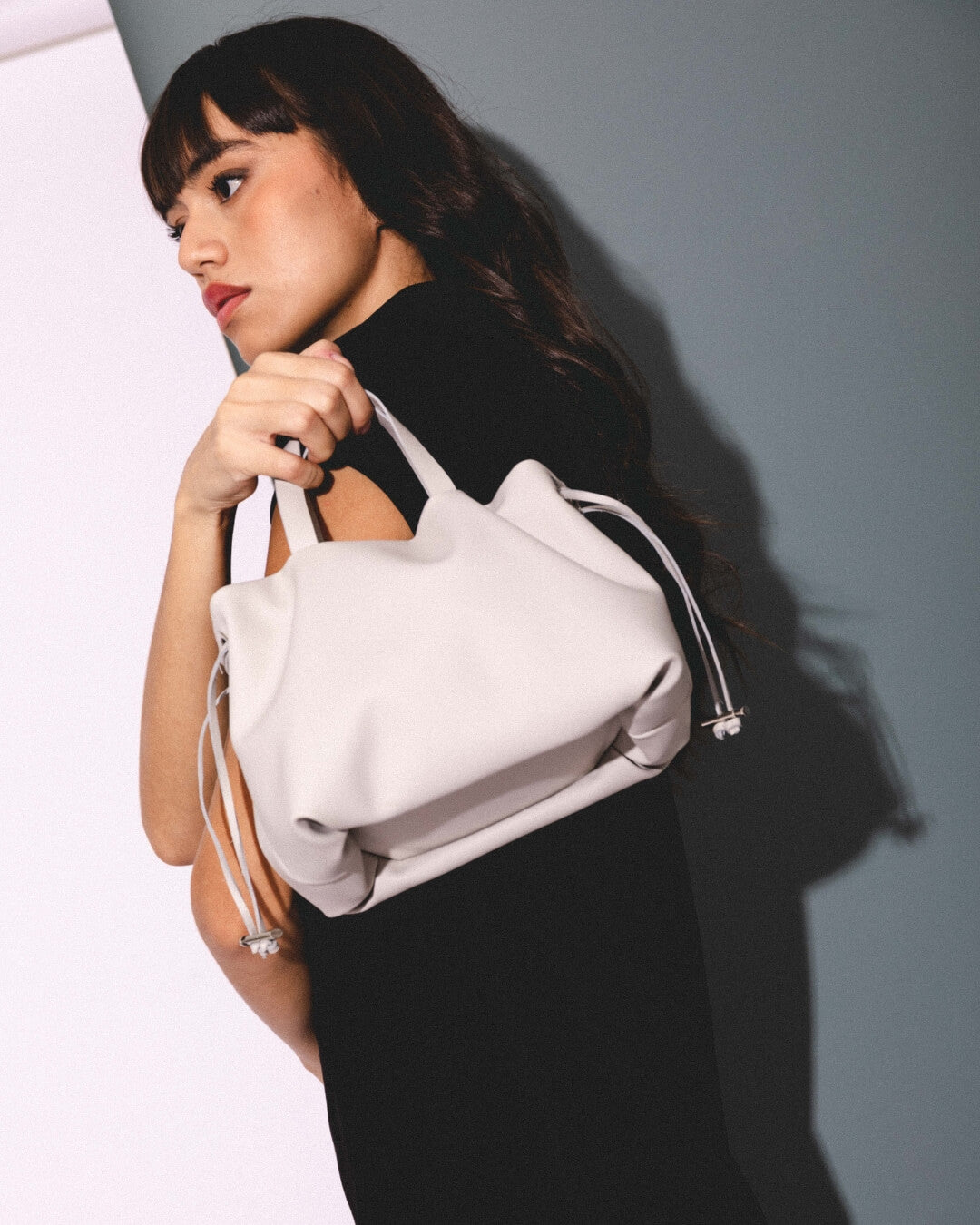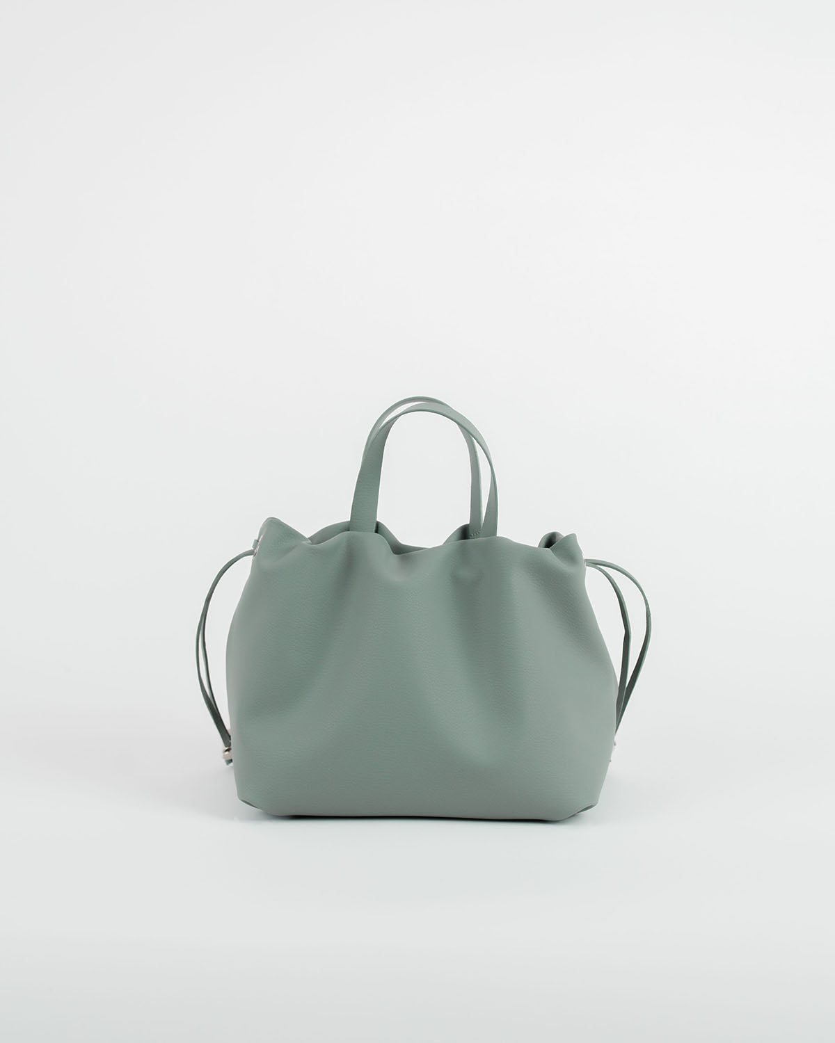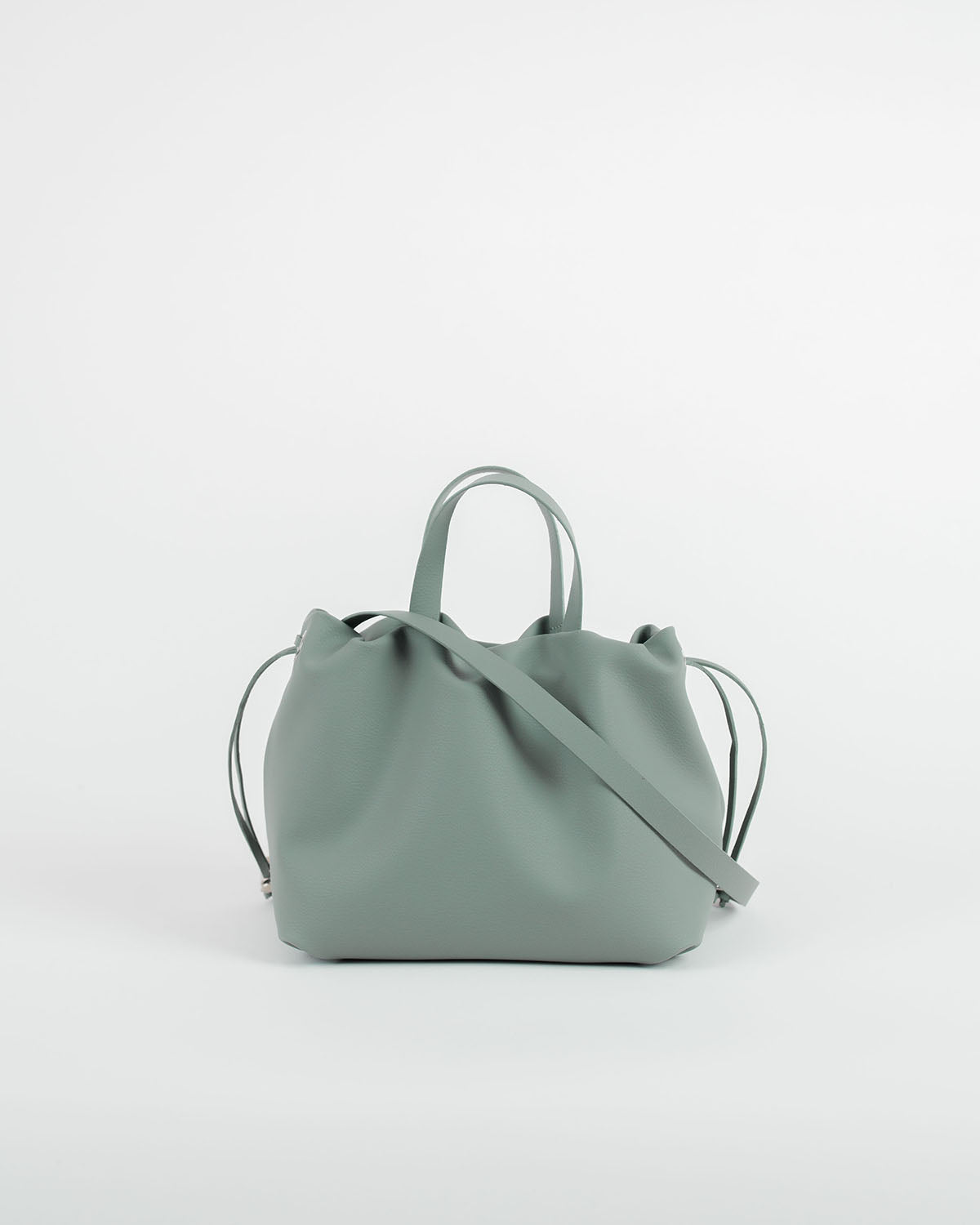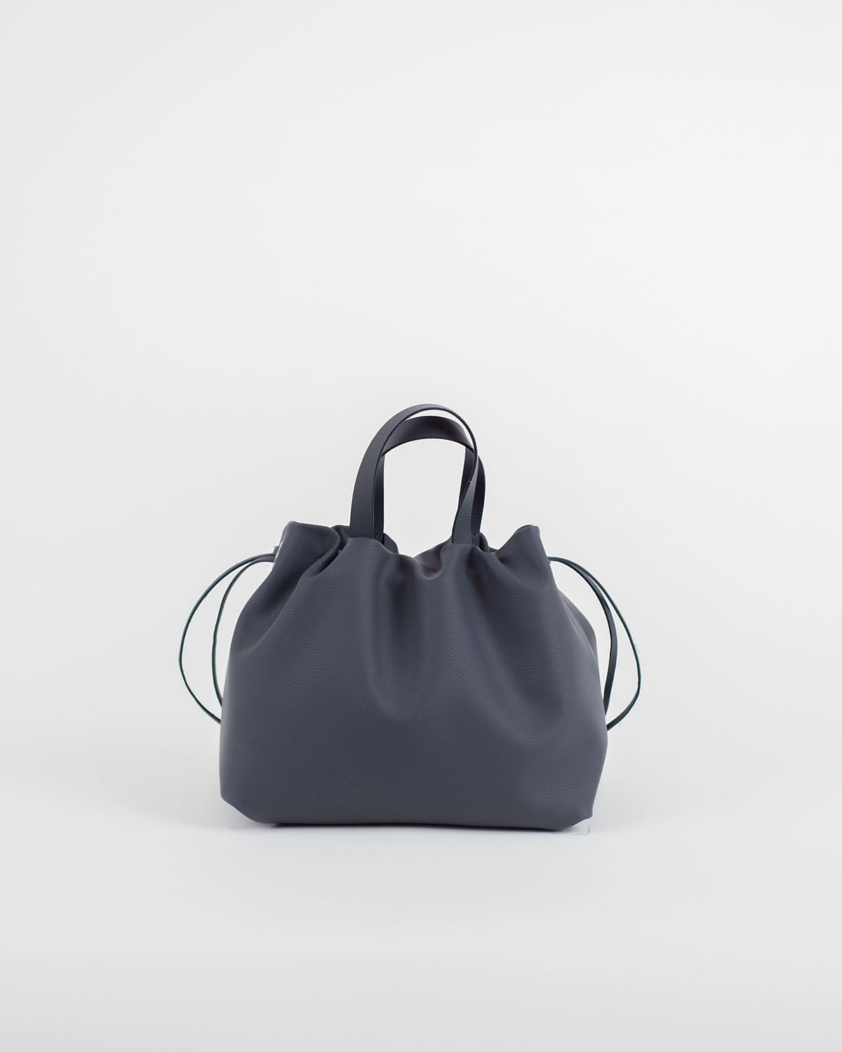 Tiene cierre de cordón que le da ese aspecto fruncido, además de un cierre de imán central y en el interior está forrada con lona de algodón orgánico muy agradable.